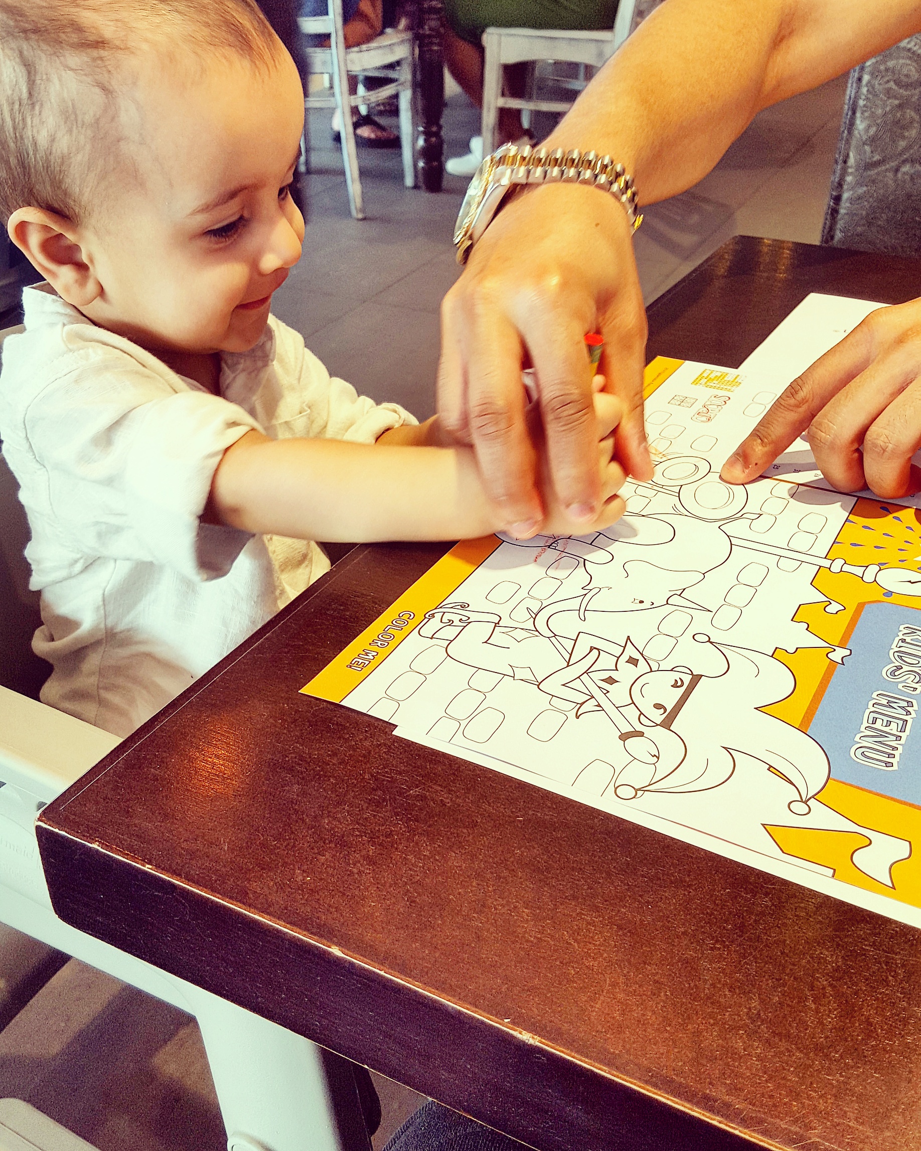 We came here on a Saturday afternoon after taking little Khalifa to play. The restaurant had many people but it’s not so bad that you have to worry about waitlists, like many of the other restaurants in the newer area of JBR. We were seated quickly and they brought out a baby highchair for Khalifa, as well as some crayons and a coloring sheet, which also had the kids menu on it. Little Khalifa is only 1 year and a few months so he doesn’t really know how to color yet, but that didn’t keep him from trying! That coloring sheet definitely kept him busy for a while.