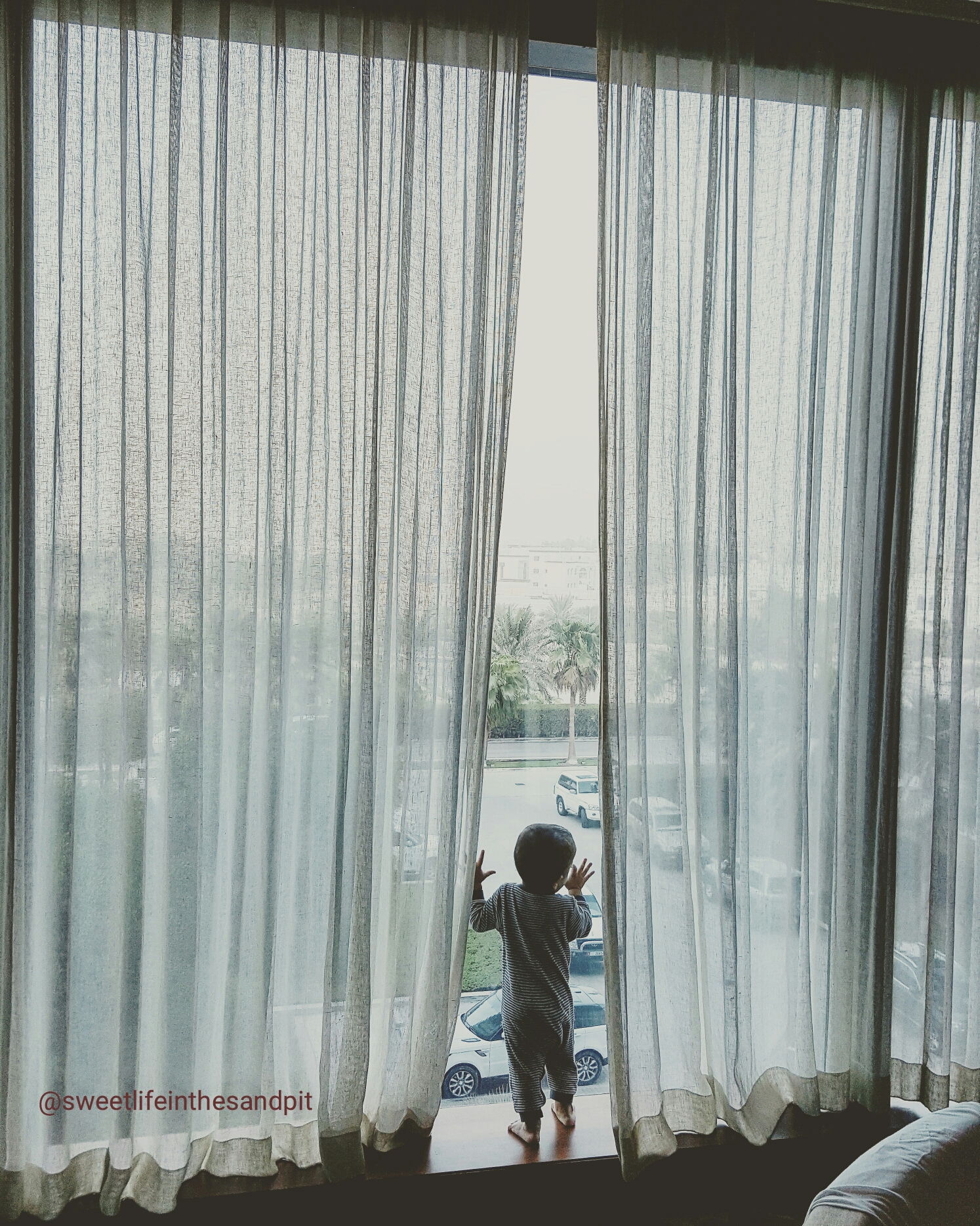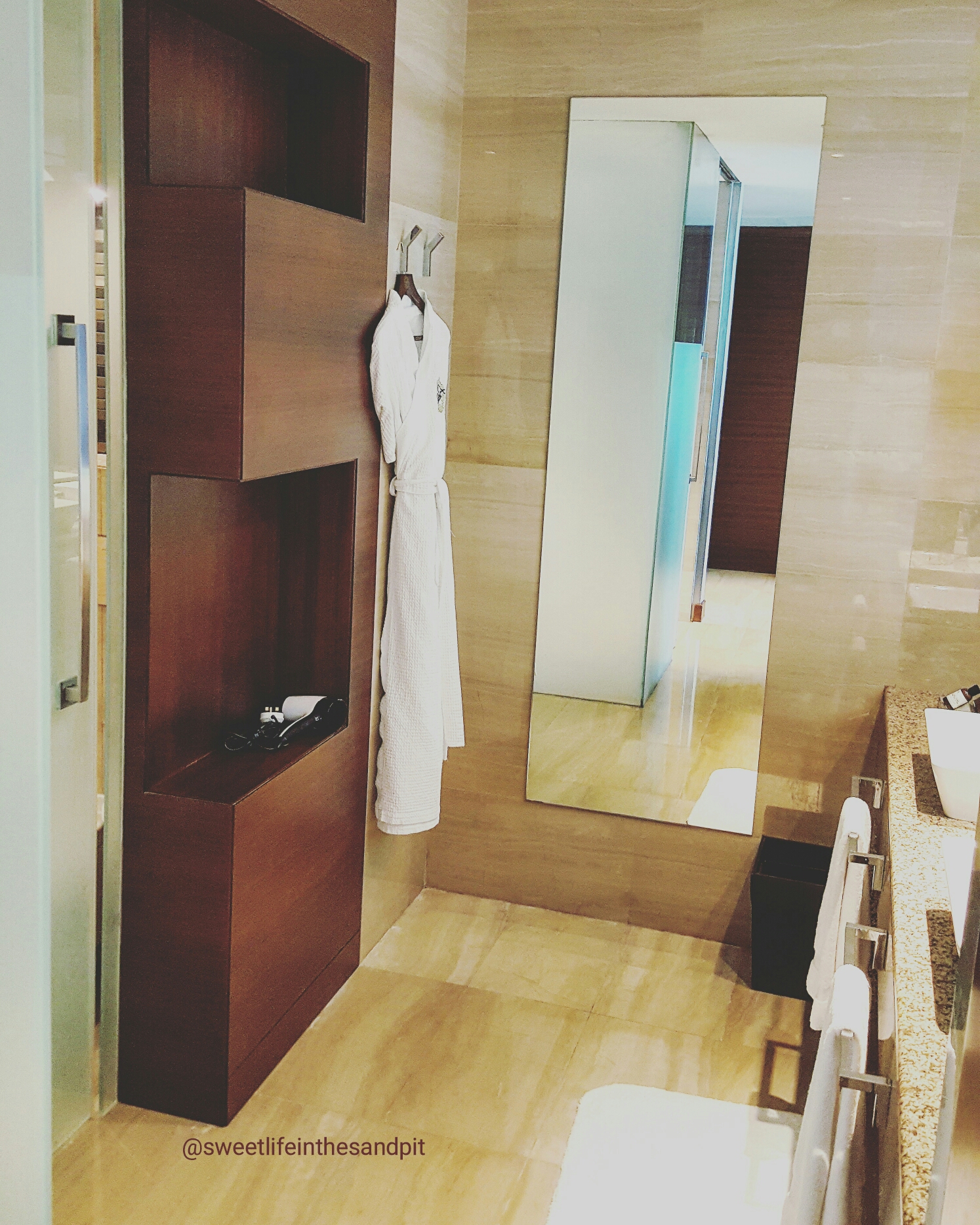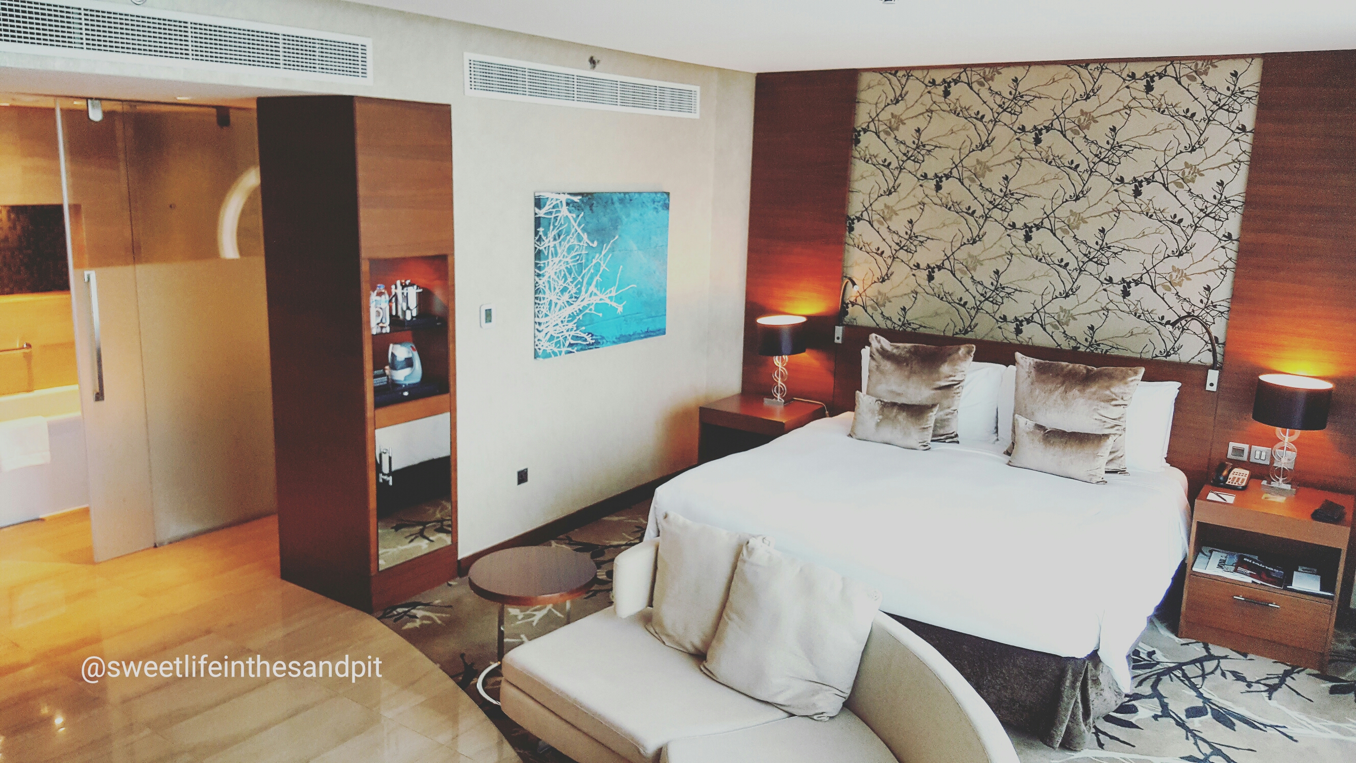 We were lead to our room and it was actually very spacious. The room, although laid out in a flat open plan, was very well organized into different sections. There is a work desk, a couch/living area, a spacious bathroom (that separated the toilets, bath/shower and  sinks/vanity into three different rooms), a large and extremely soft cloud-like bed and a closet. They’re very generous with space, and it easily and comfortably could occupy me, the hubby and baby Khalifa. The closet was a bit small, but with so much space and only a stay of 2 days, it fit our clothes and bags just fine.