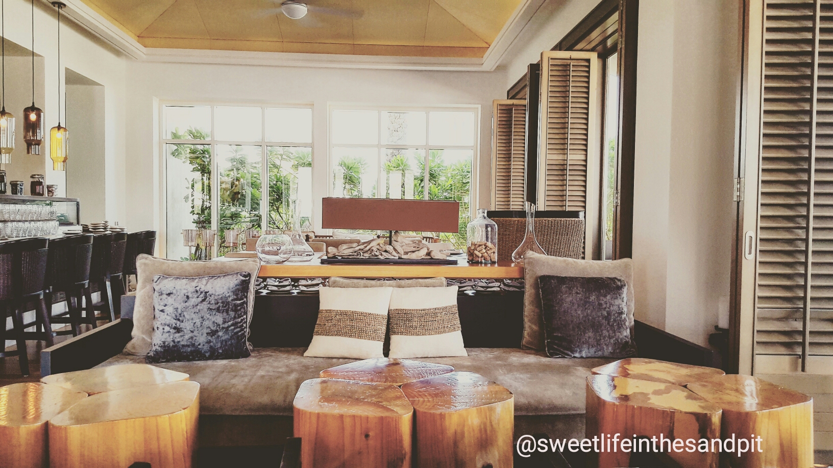 Although the weather was perfect outside, we decided to sit inside since little Khalifa is sometimes sensitive to breezy winds. We came soon after the restaurant opened, at 9.30am so it was still quiet and we were seated by the window, with a beautiful view of the pool as well as the beach. The decor of the place is absolutely amazing! It’s got the perfect dream beach/vacation home feel to it. Here’s Khalifa, in his PJs, patiently waiting to have some of his Baba’s omelette 🙂