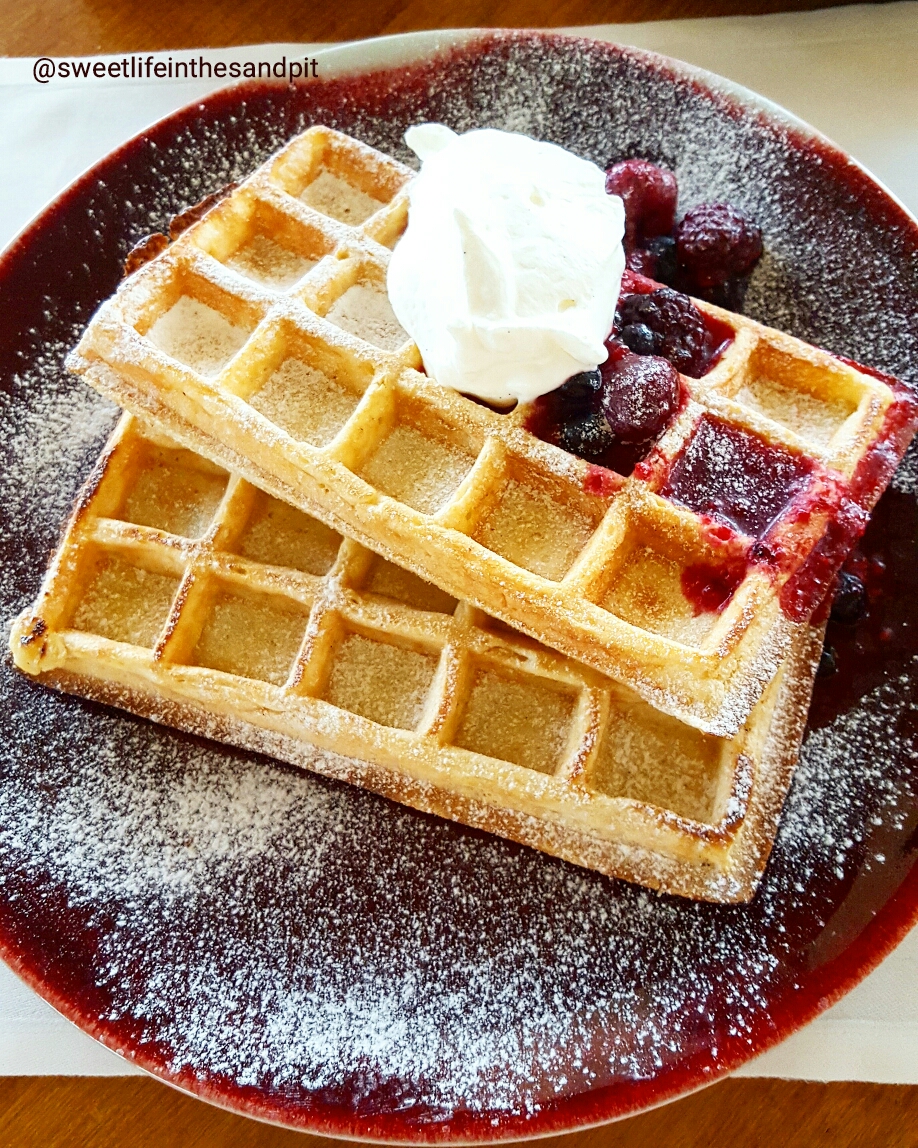 The French Omelette came with many sides including beef bacon, sausages, mushrooms, delicious baby potatoes, cherry tomatoes and some micro greens. Everything on it was so well seasoned and the omelette itself was fluffy and perfectly cooked. My quiche was so delicious, that I’m literally still craving it now as I type. It came with a simple salad of greens and a light vinaigrette dressing. It was on the smaller side though, so I was glad that I ordered the waffles as well. The waffles were perfect– crispy on the outside and light a fluffy in the middle. It came with a delicious compote made from a variety of berries, and a very smooth and light whipped cream. Yum!
