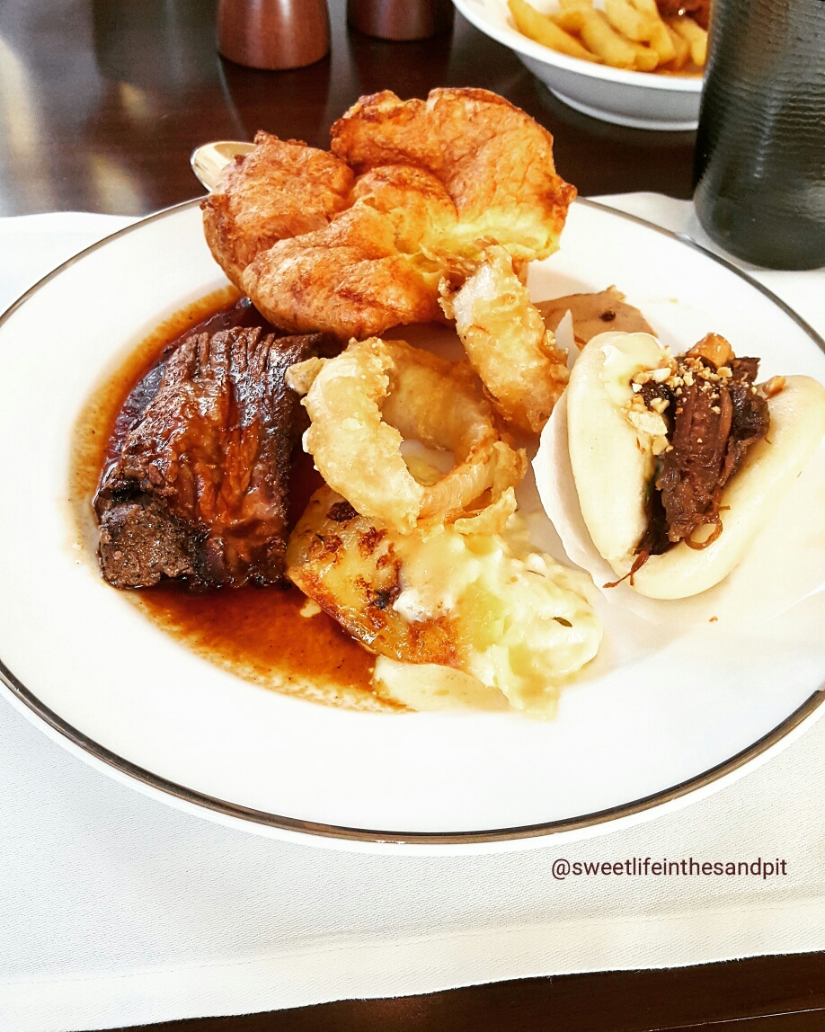 If your feeling meat-y there’s a carving station with all of the different kinds of comfort foods including brisket, baked salmon, Yorkshire pudding, and delicious gravy. There’s also things like potatoes au gratin and crispy battered onion rings. There’s also a station where you can get