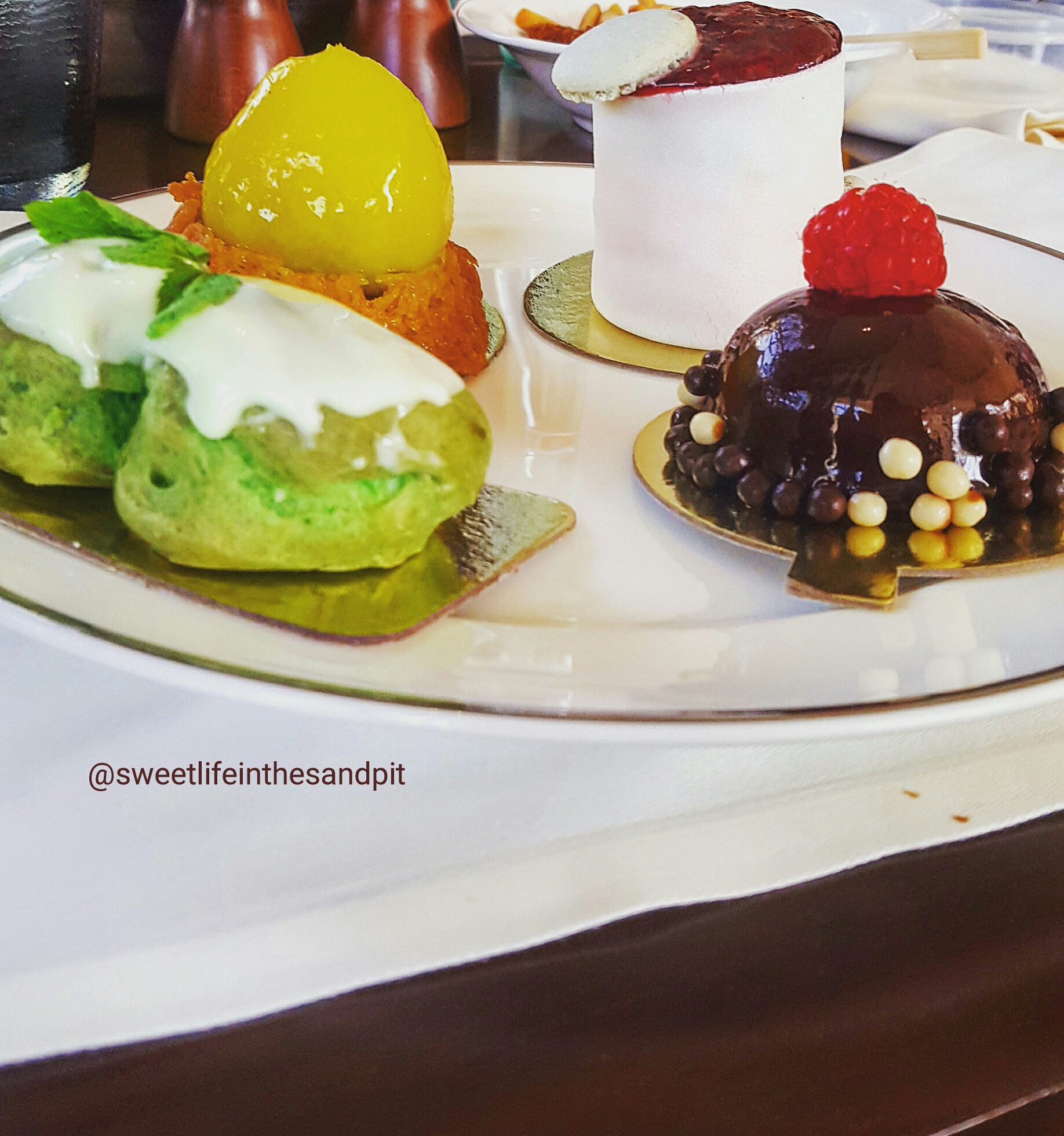 Now my favorite thing from this whole brunch was the desserts. There were 3 dessert areas– first the large spread of mini cakes, and then there’s a table with fruits and a chocolate fountain, then there was also a gelato cart! All of the mini cakes looked so good, so I had a taste of a few but my favorite was the matcha green tea eclair. Oh my god, so yum!