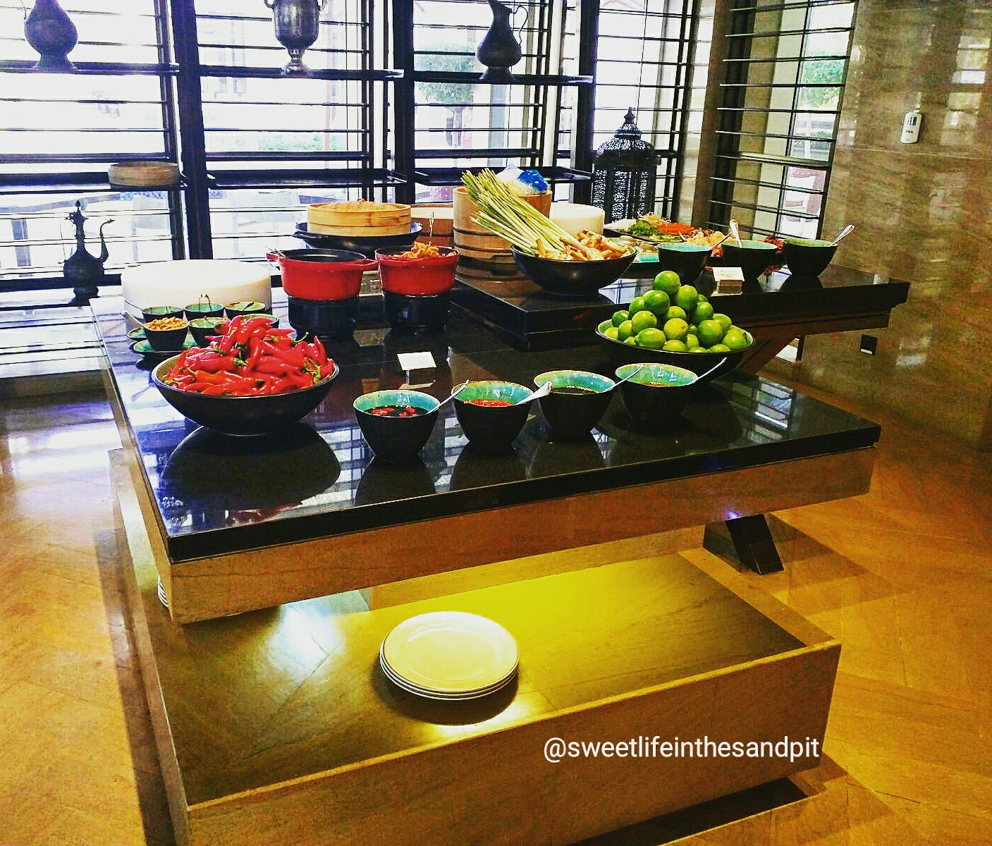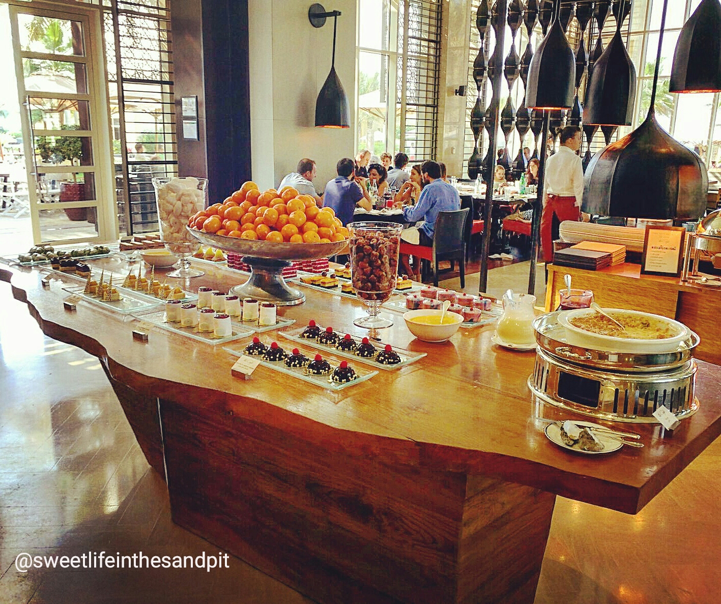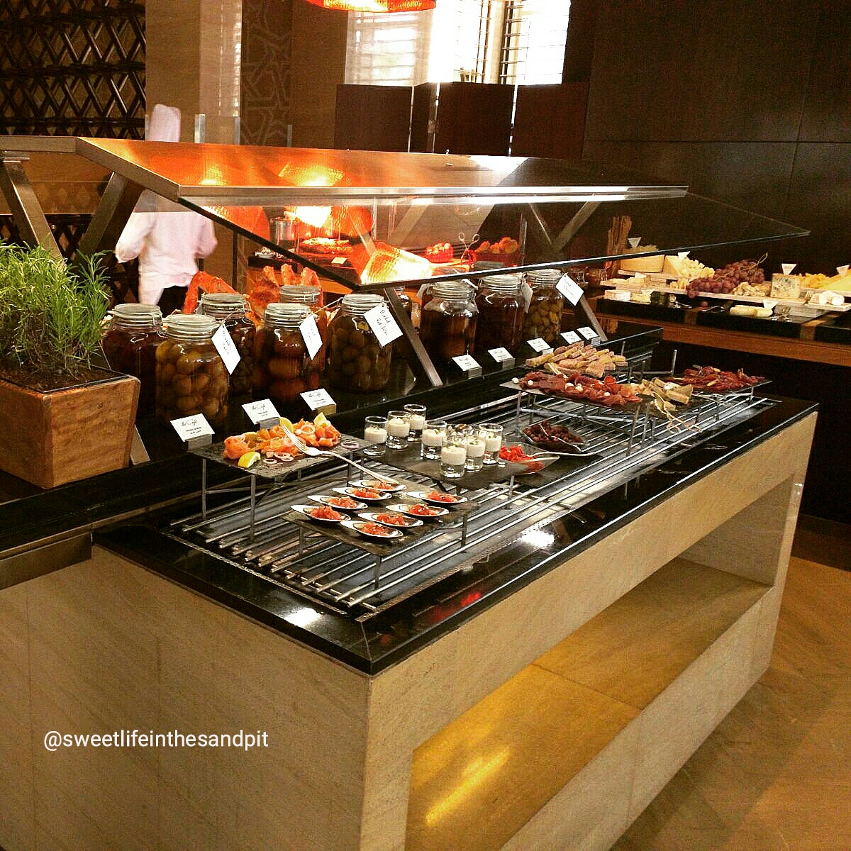 Right after checking in and seeing our lovely room, we headed down to Friday Brunch. We came in to The Cafe through the outside door, so we were able to see all the different things that happen on the outside, before we were seated indoors. Firstly, the brunch includes access to the pool, so as your walking across the courtyard, theres many people enjoying the pool area. There’s also plenty of seating outdoors if you want to enjoy the nice weather thats finally arriving. On the corner of one of the outdoor seating areas, there is a grilling station where you can have all types of seafood and steaks grilled.