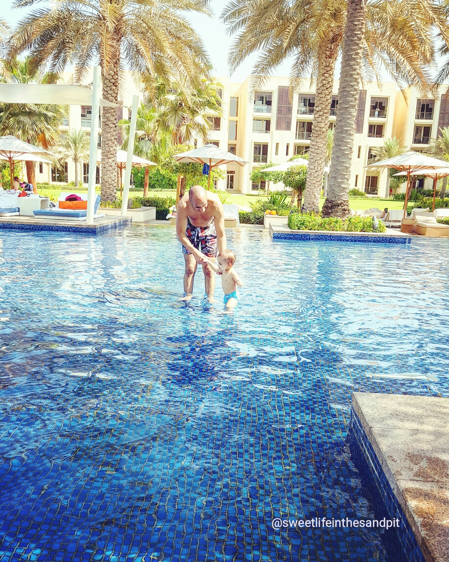 We spent the rest of the afternoon exploring the grounds of the hotel and enjoying the pool. And by ‘pool’, I mean several different pools. I honestly don’t even know how many pools Park Hyatt Abu Dhabi has because there were so many to choose among. From what I saw, there’s a large shallow one (perfect for lounging by), there’s several family friendly pools, a toddler/kiddie pool, a 16+ pool, and also several different semi-private pools with their own lounging chairs. We’ve been to many 5-star resorts around the UAE but Park Hyatt Abu Dhabi is definitely the best one if your looking for a weekend by the pool! Here’s a pic of Khalifa guiding his Baba (AKA Sea Horse, haha):