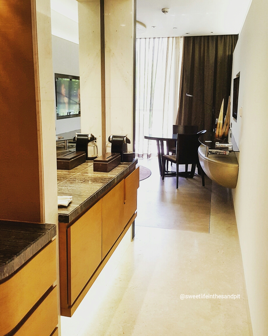 There’s a long counter in the room’s hallway where the Nespresso coffee machine along with several different types of coffee pods, as well as gourmet teas are offered complimentary. Along with that, are the mini bar and several snacks neatly tucked away in the cabinets below.