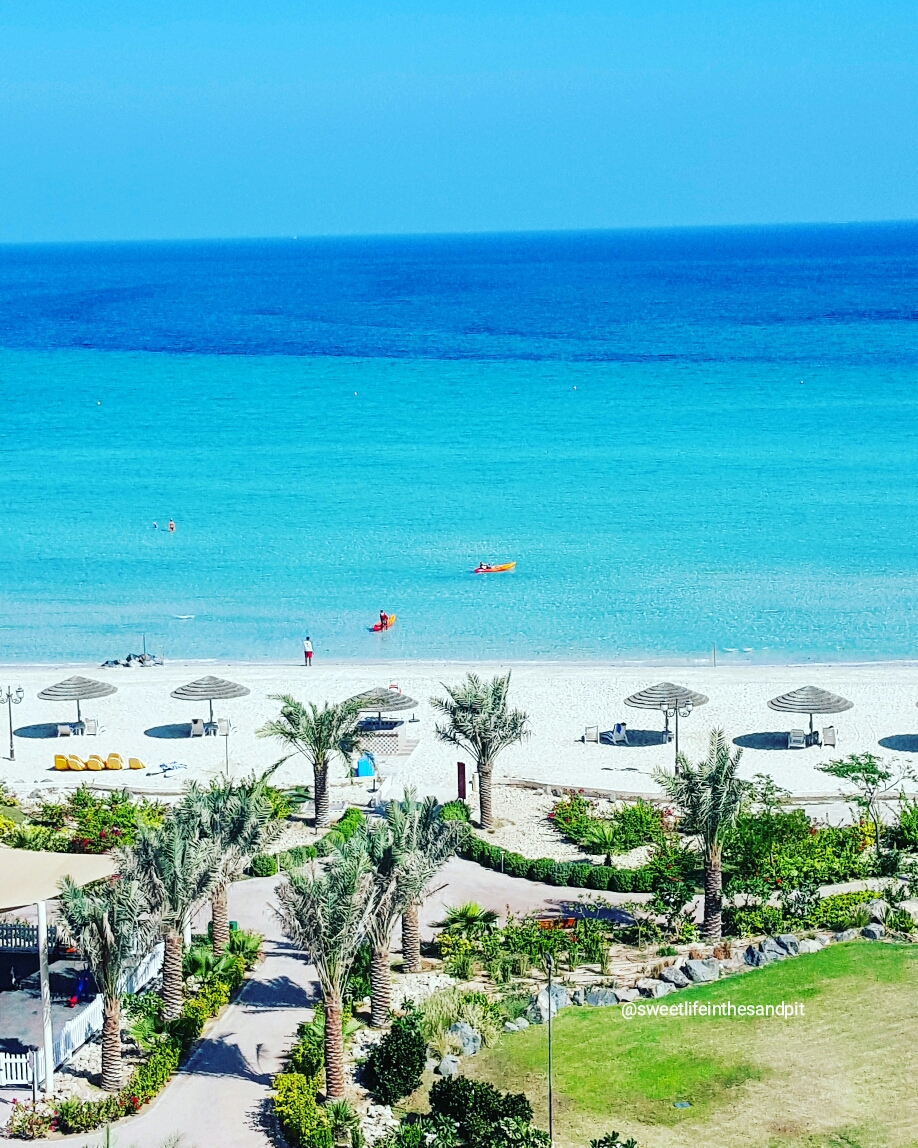 We spent 3 days at the most beautifully secluded beach resort in the UAE, Danat Jebel Dhanna Resort. When we first got here, I though “oh cool, a pool and a beach to spend the weekend by”, but little did I know that there is so much more that this resort has to offer! The ocean is seriously crystal clear. You can walk straight into the sea for nearly a mile before the water even gets to your chest. The sea has barely any rocks and very few shells, and you feel that soft, clean sand under your feet. It really is my newly favorite beach in the UAE and I would really recommend that my friends in Dubai make the trip out. Not only is the beach really the best that I have seen in the UAE, but the amount of water activities that the hotel provides can keep you thoroughly busy throughout your stay there. There’s banana boat rides, wake boarding, knee boarding, wind surfing, kayaking, snorkeling, boat cruises and even deep sea fishing!