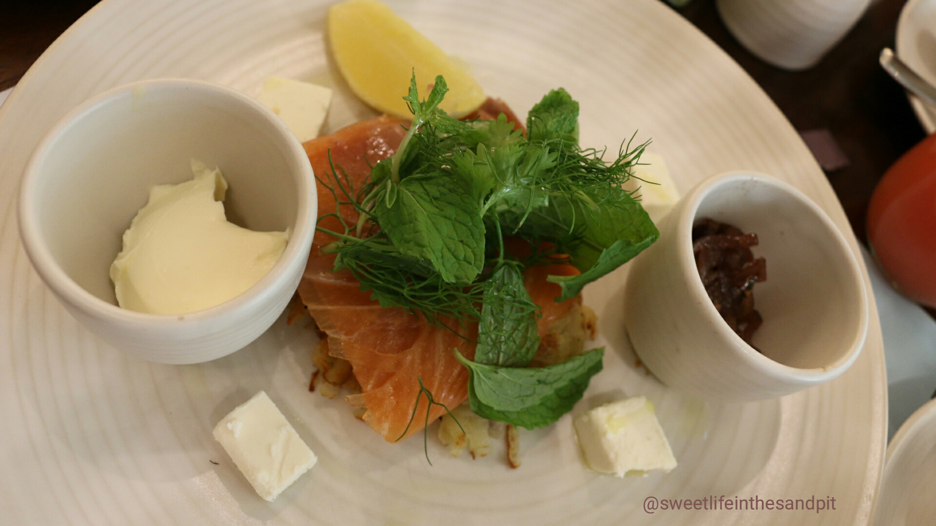 The Potato Pancake, or as we would say in America– the hashbrown– was definitely a smaller portion. It’s topped with greens and comes with a side of either smoked salmon or beef bacon.