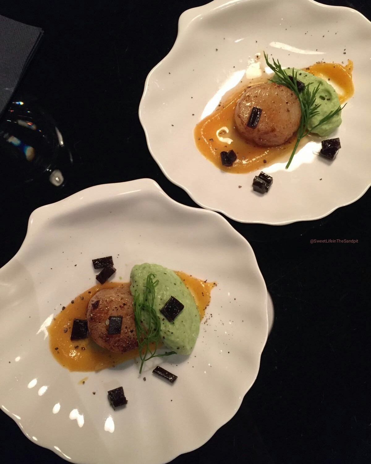 Within just a few minutes, two plates of Scallops with Mint and Pea Puree came. The scallop was slightly seared and next to it was a refreshing and foamy puree of peas and mint. The puree and the scallop were laid on top of a chutney spread that had an ever-so-slight taste of orange rind in it. Scattered on top of the dish was a Indian-style licorice called ampapad, which the chef later explained,was a common childhood favorite in India. The flavors of the dish, although may not sound like they have anything to do with each other, actually came together so well!