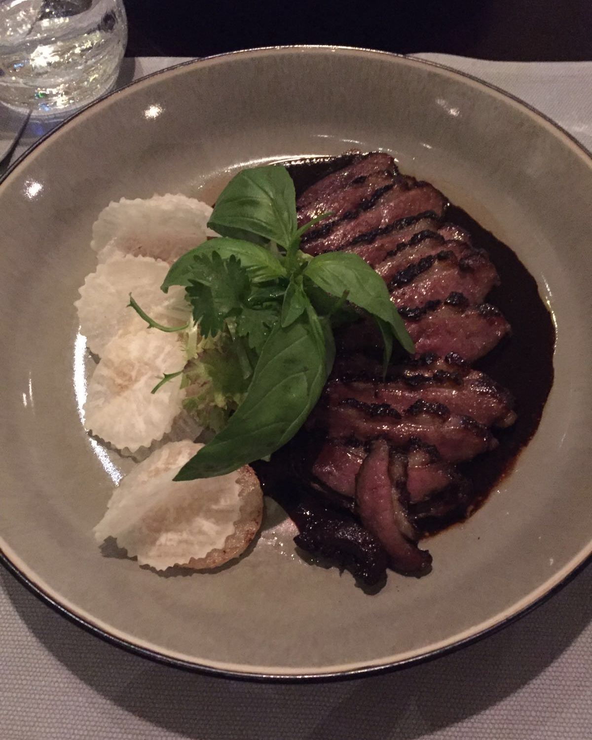- Honey and Ginger Braised Muscovy Duck Breast with radish and jicama as garnish
