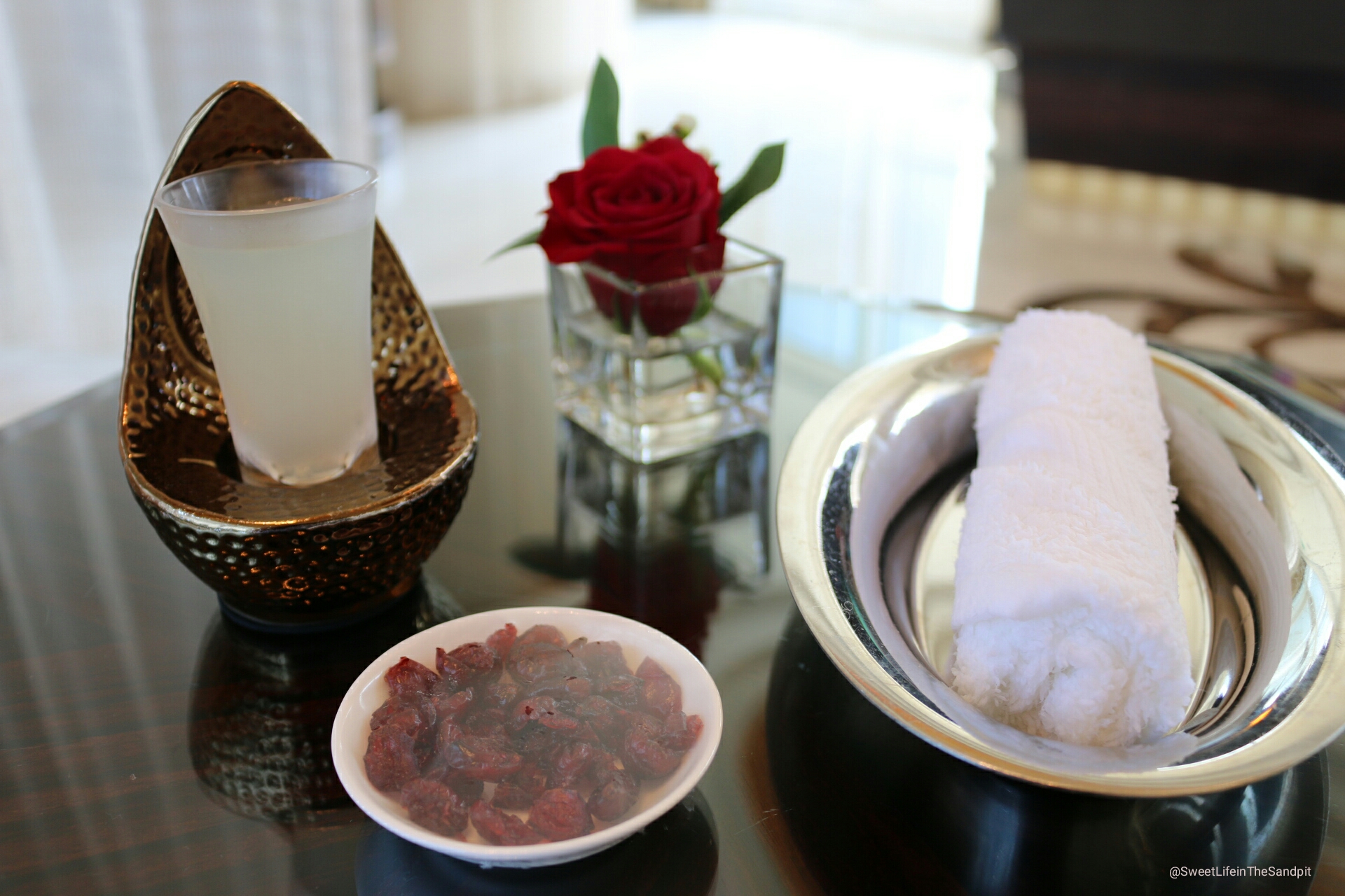 I went to the spa’s reception desk and gave them my name. They confirmed my appointment and then asked me to take a seat so that I could fill out a quick form that questioned any medical concerns that I might have. During this time, they also brought me a beautifully presented platter, which had a welcome drink, a warm towel and dried berries.
