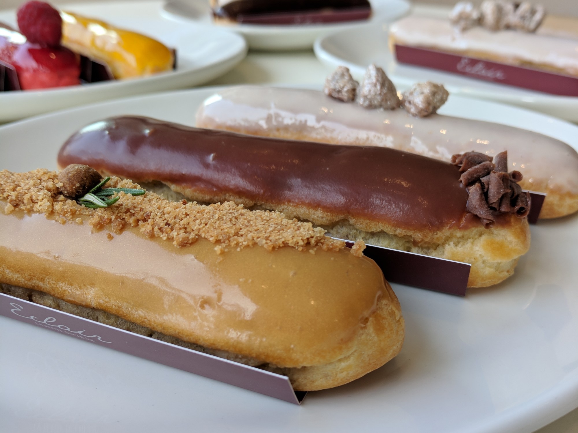 Menu and What We Tried: They have so many different kinds of eclairs– with flavors like salted caramel, rosemary, rose pistachio, dark chocolate, hazelnut, passion fruit, chestnut, and so many more, the choice was tough!