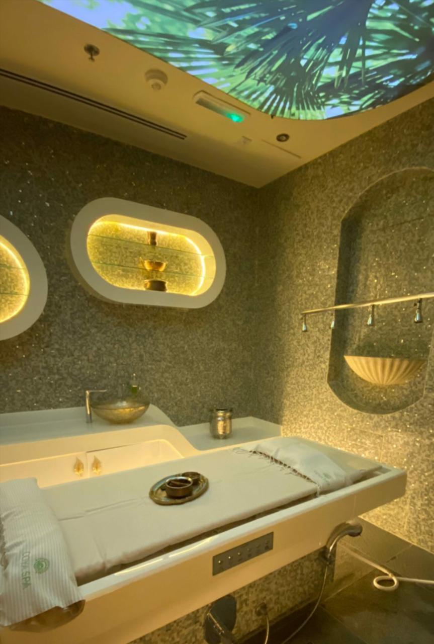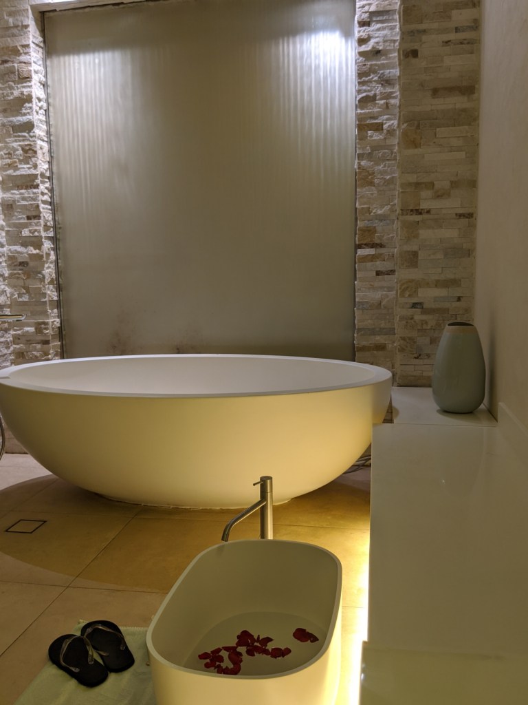 First up was the facial. I filled out a quick form (as you usually do before a massage or facial) and was taken to the treatment room. The treatment room was incredible! There was a floor to ceiling water fountain, a large bathtub, a shower, and of course the treatment bed/table.