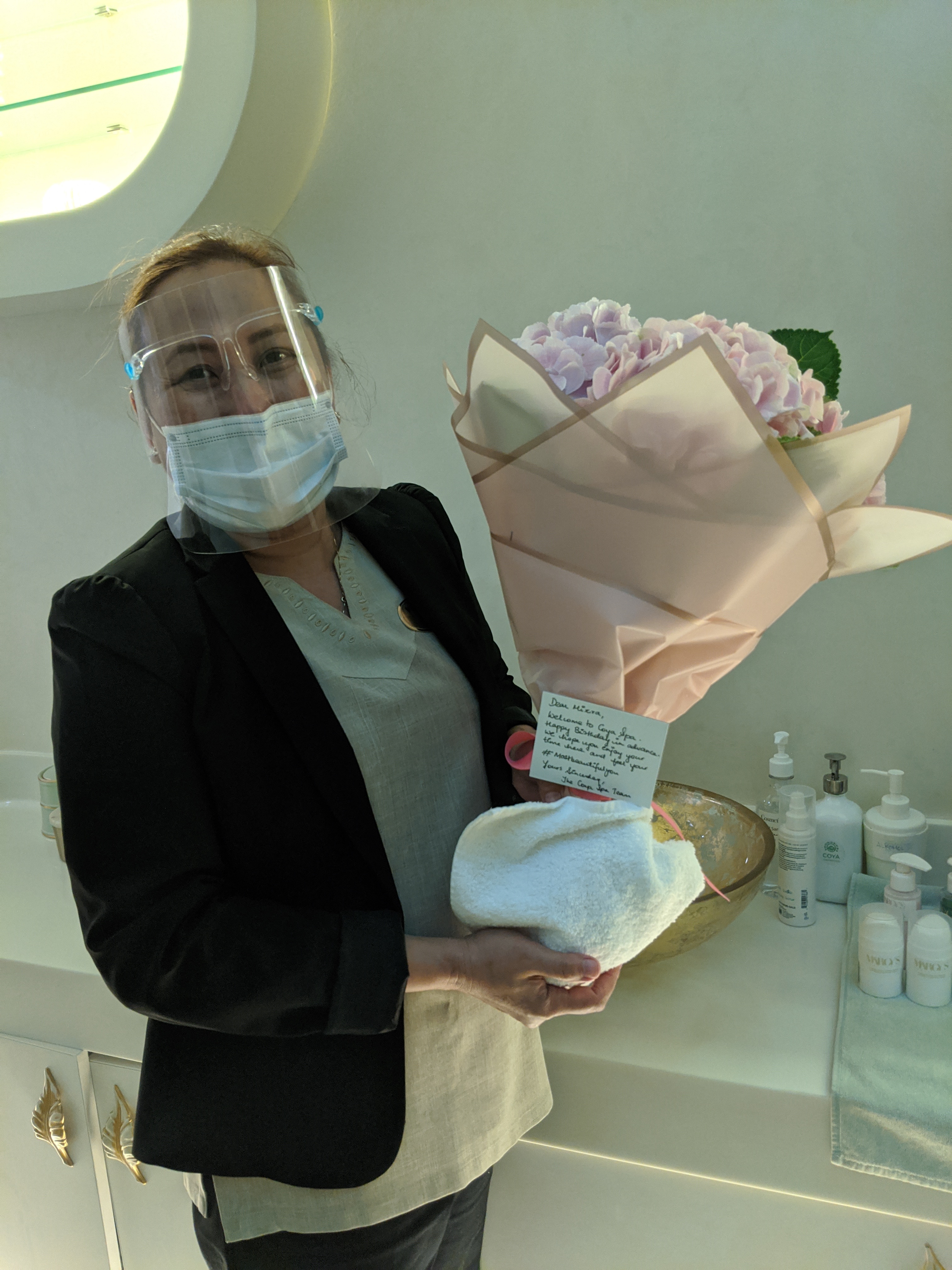 The lady who did my facial did an incredible job. She analysed my skin and suggested a vitamin C and collagen facial. The products by Margy’s Monte Carlo are lush! She took her time, and I could really see a difference in the glow of my skin afterwards. After the facial, the team at Coya Spa surprised me with a bouquet of flowers and a beautiful note! They knew it was my birthday the next day and really went all out to make me feel special! It was such a wonderful, thoughtful gesture.
